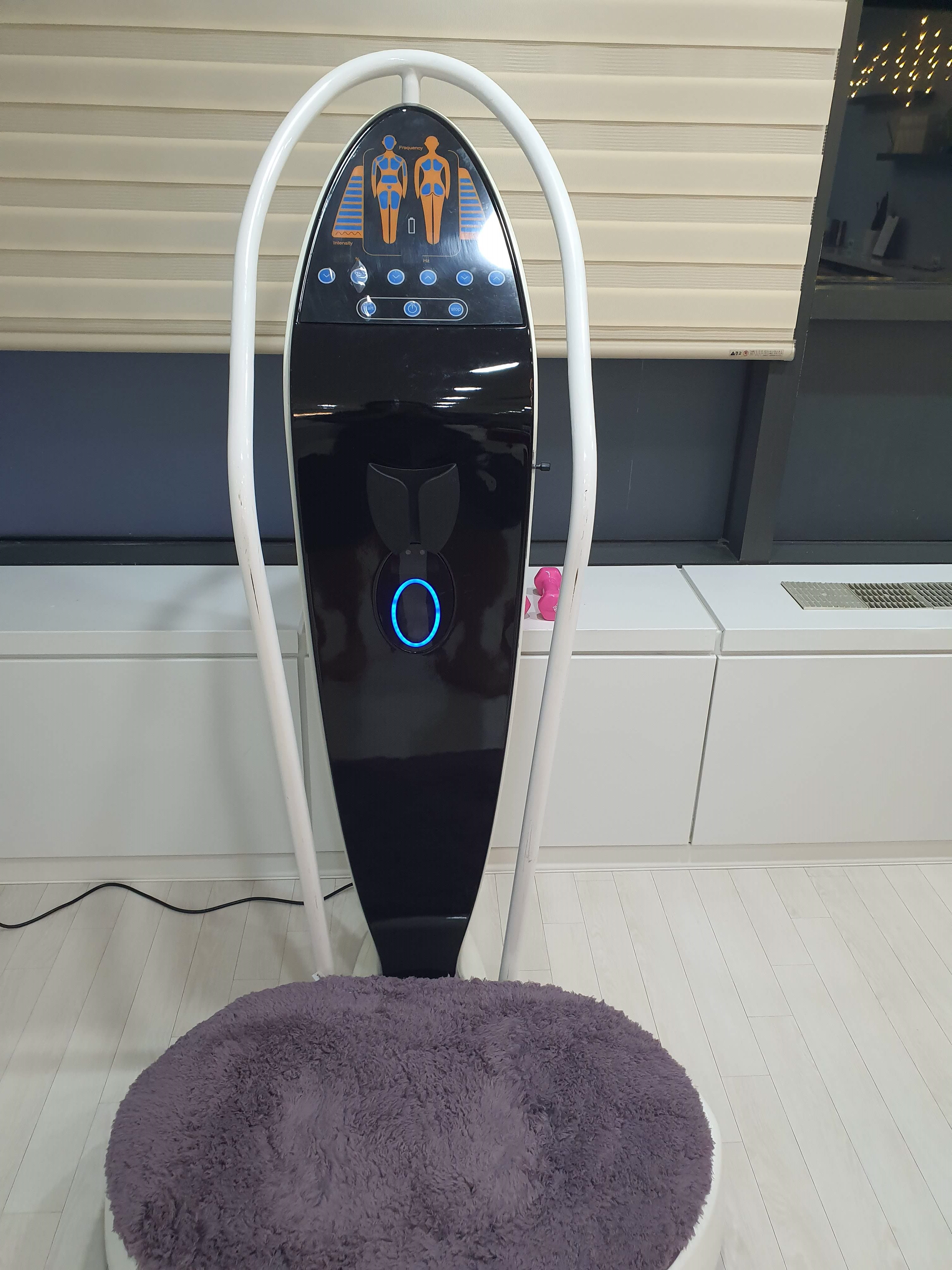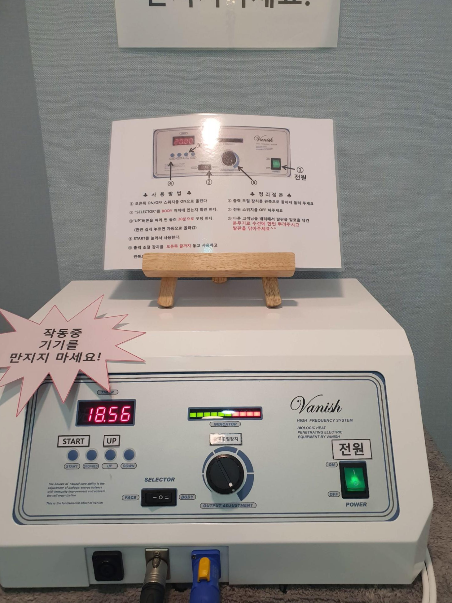 20분에 기기를 세팅하고 출력 조절 장치를 최대에 놓은 뒤 발을 올려 사용한다.