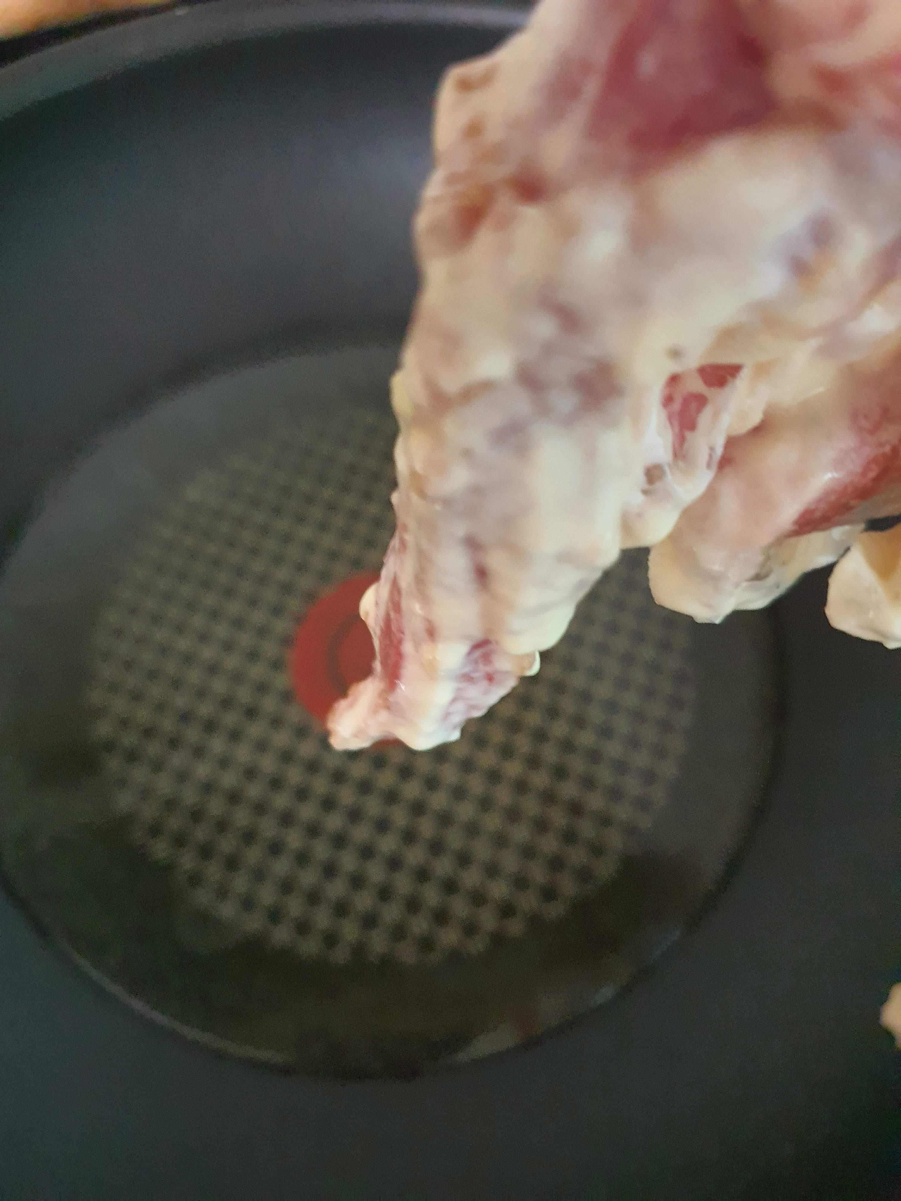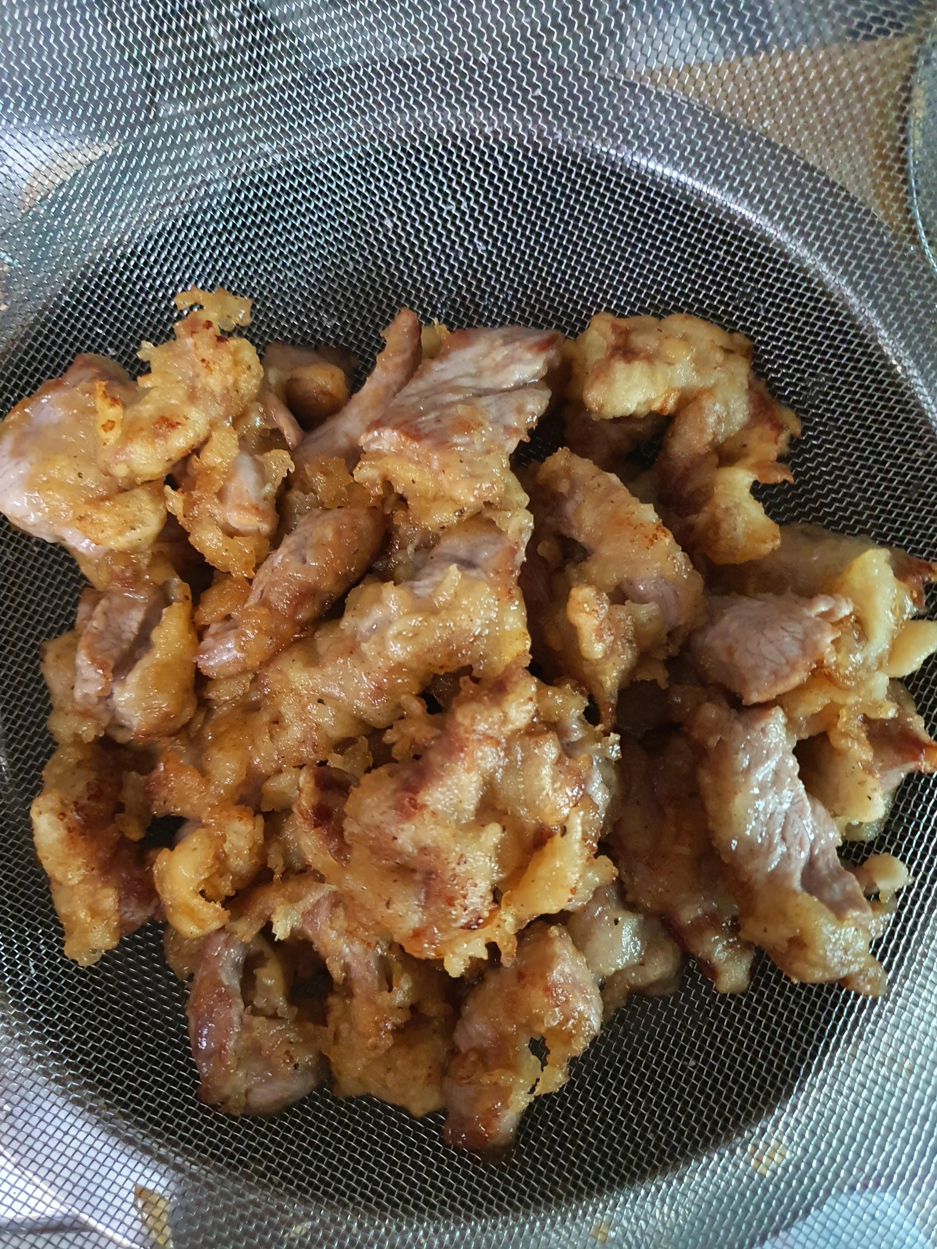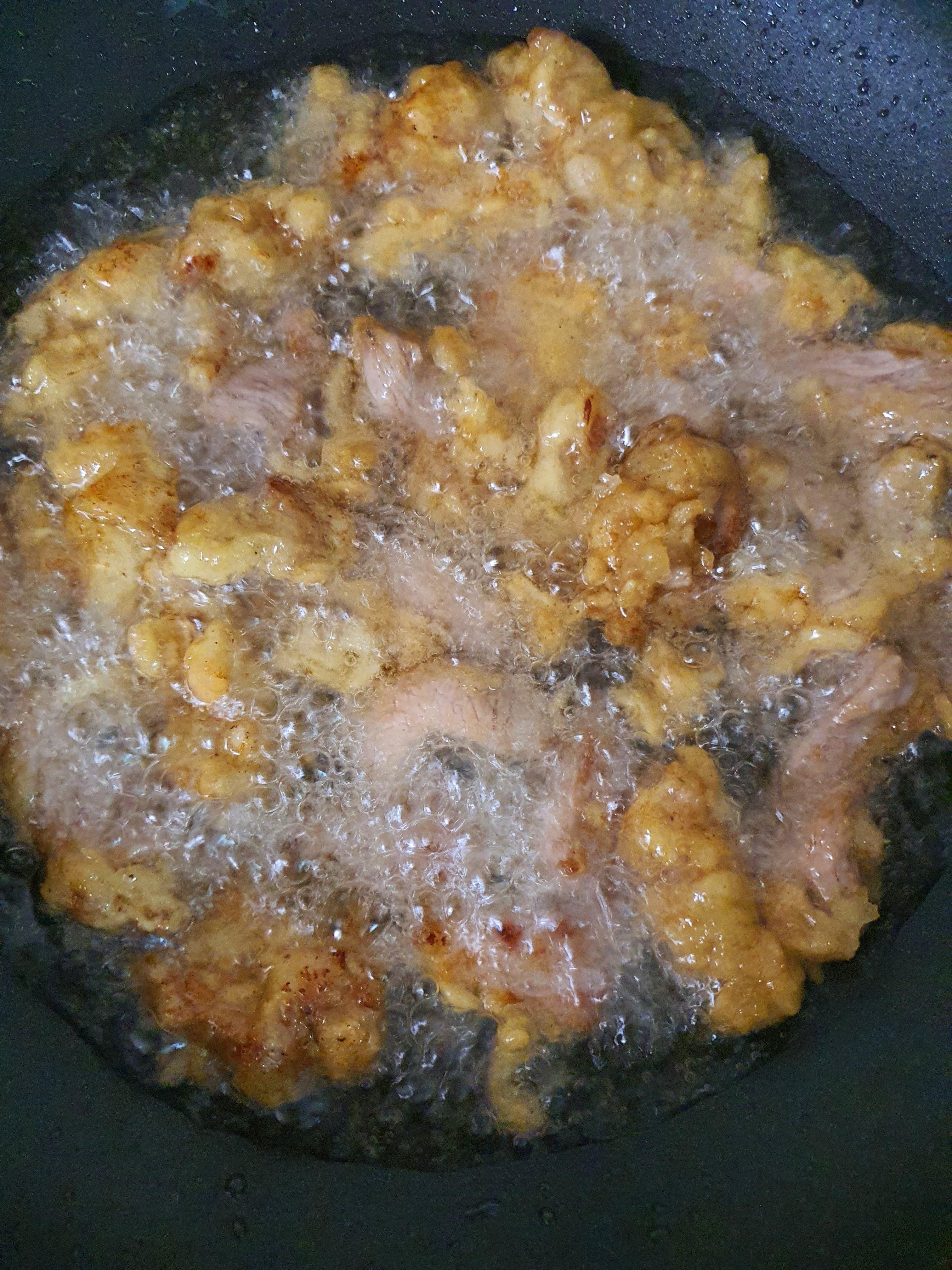 이제 끓인 기름에 고기 하나 퐁당 넣어본다.