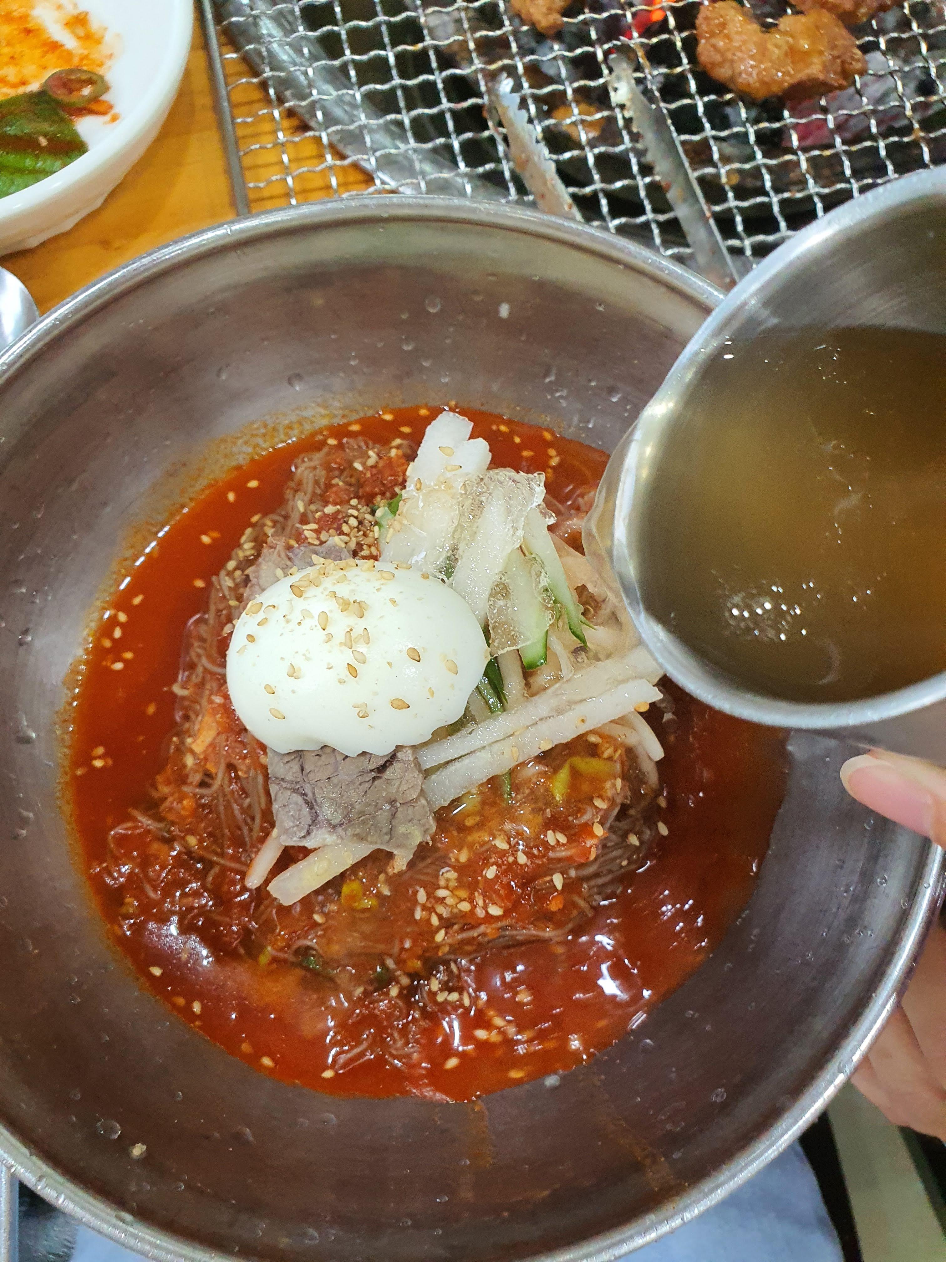 비빔냉면을 시키면 이렇게 시원한 육수도 같이 나온다.