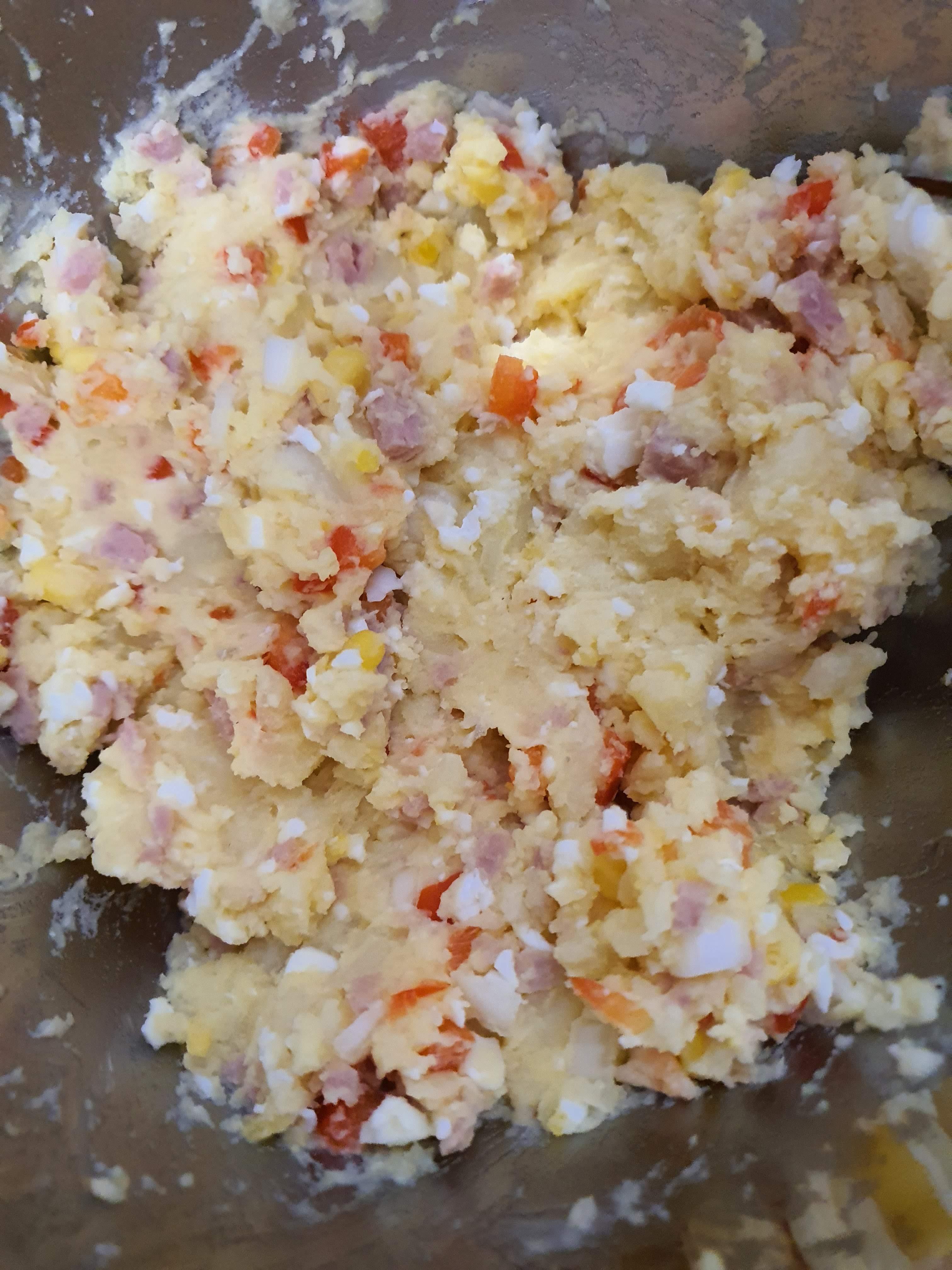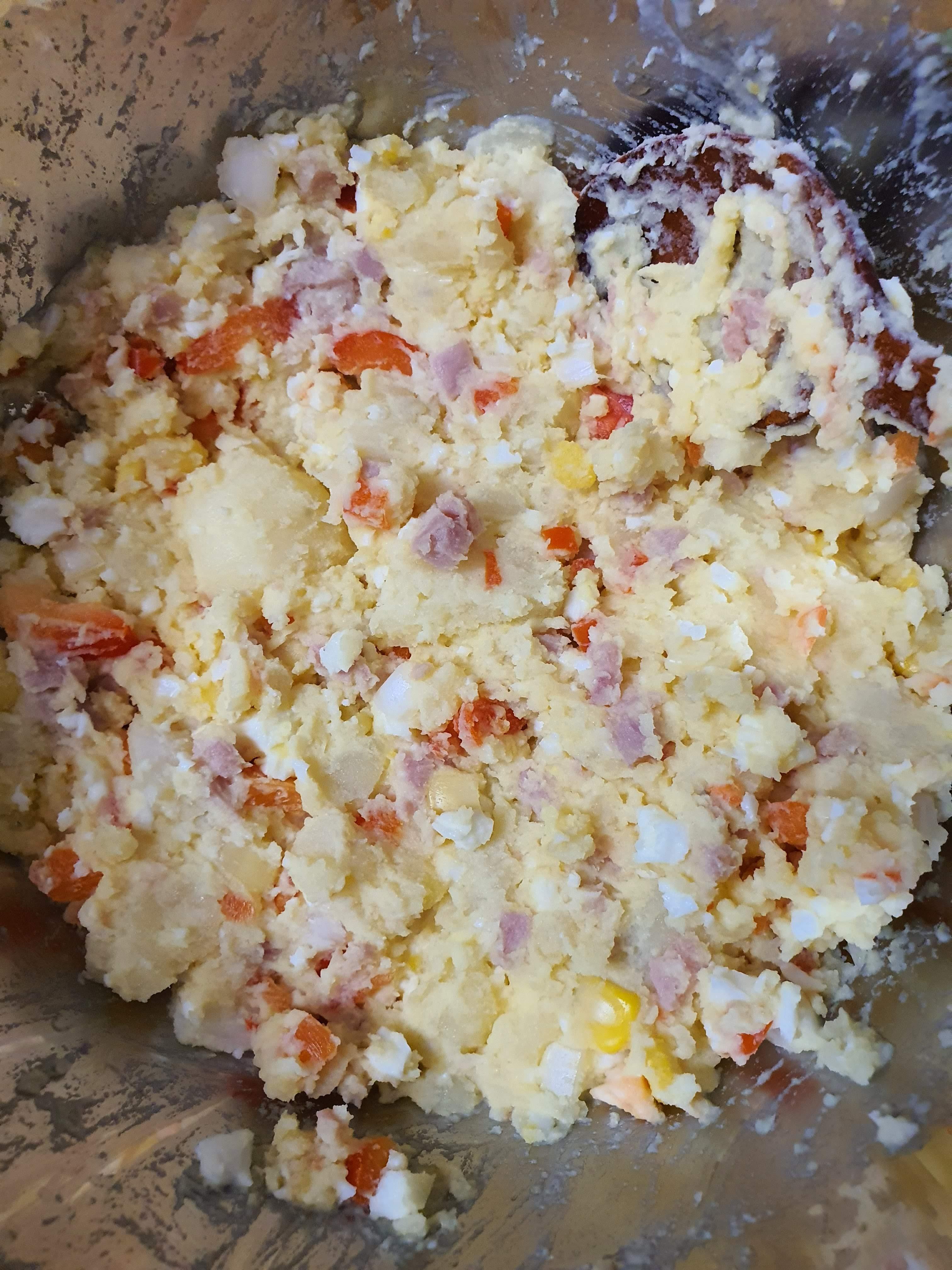재료는 감자, 계란, 양파, 파프리카, 스팸, 옥수수콘, 설탕, 마요네즈이다.