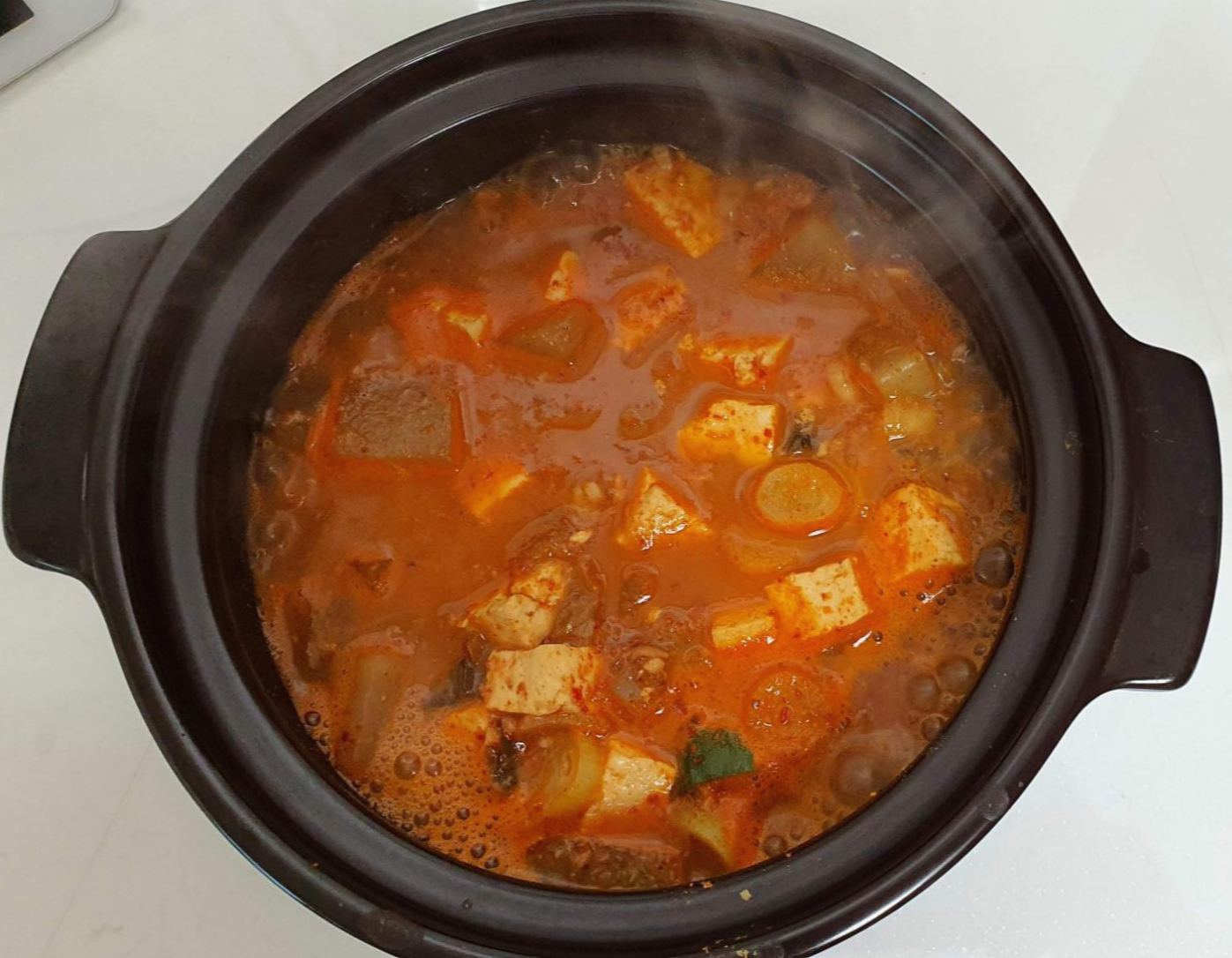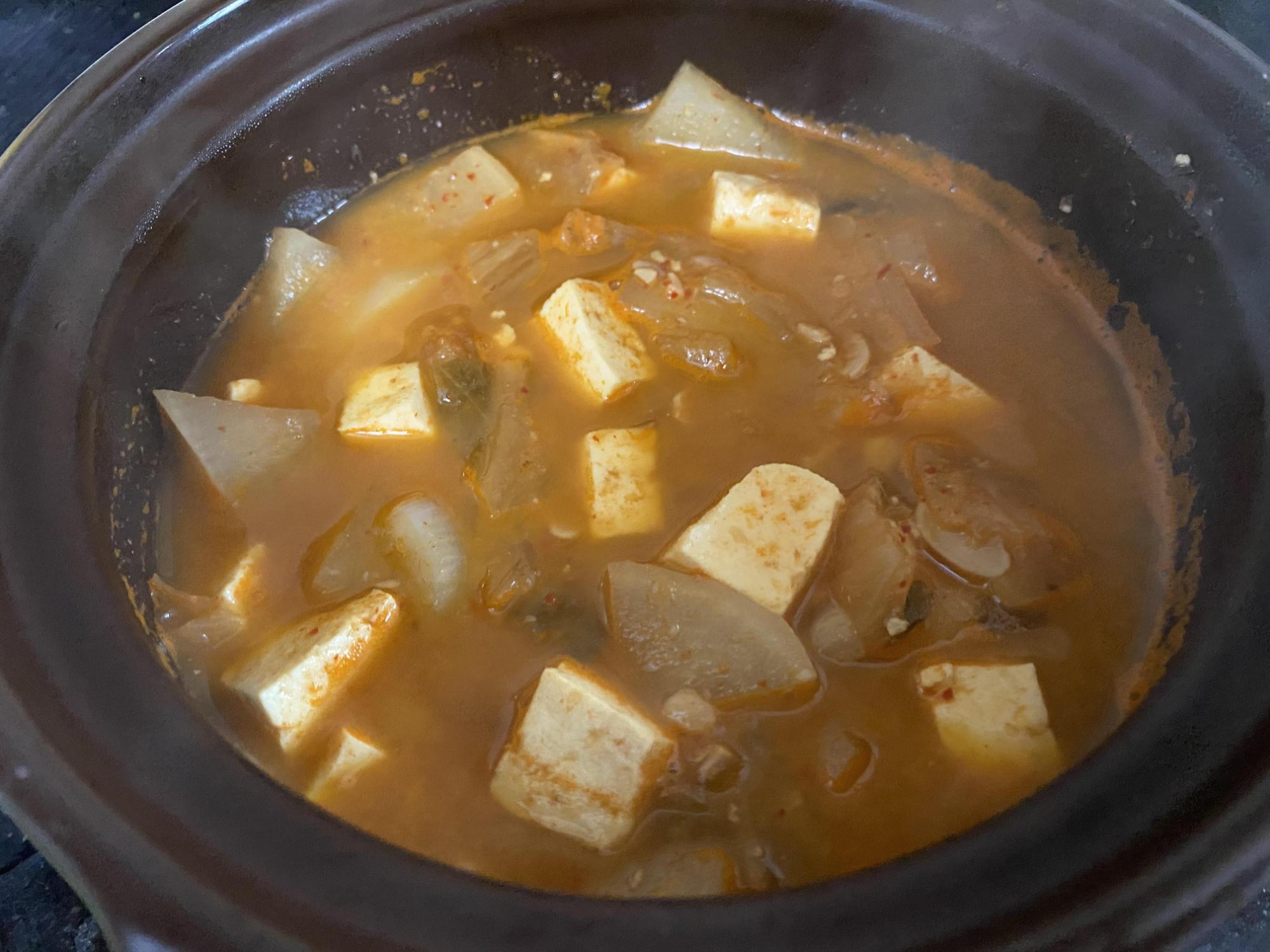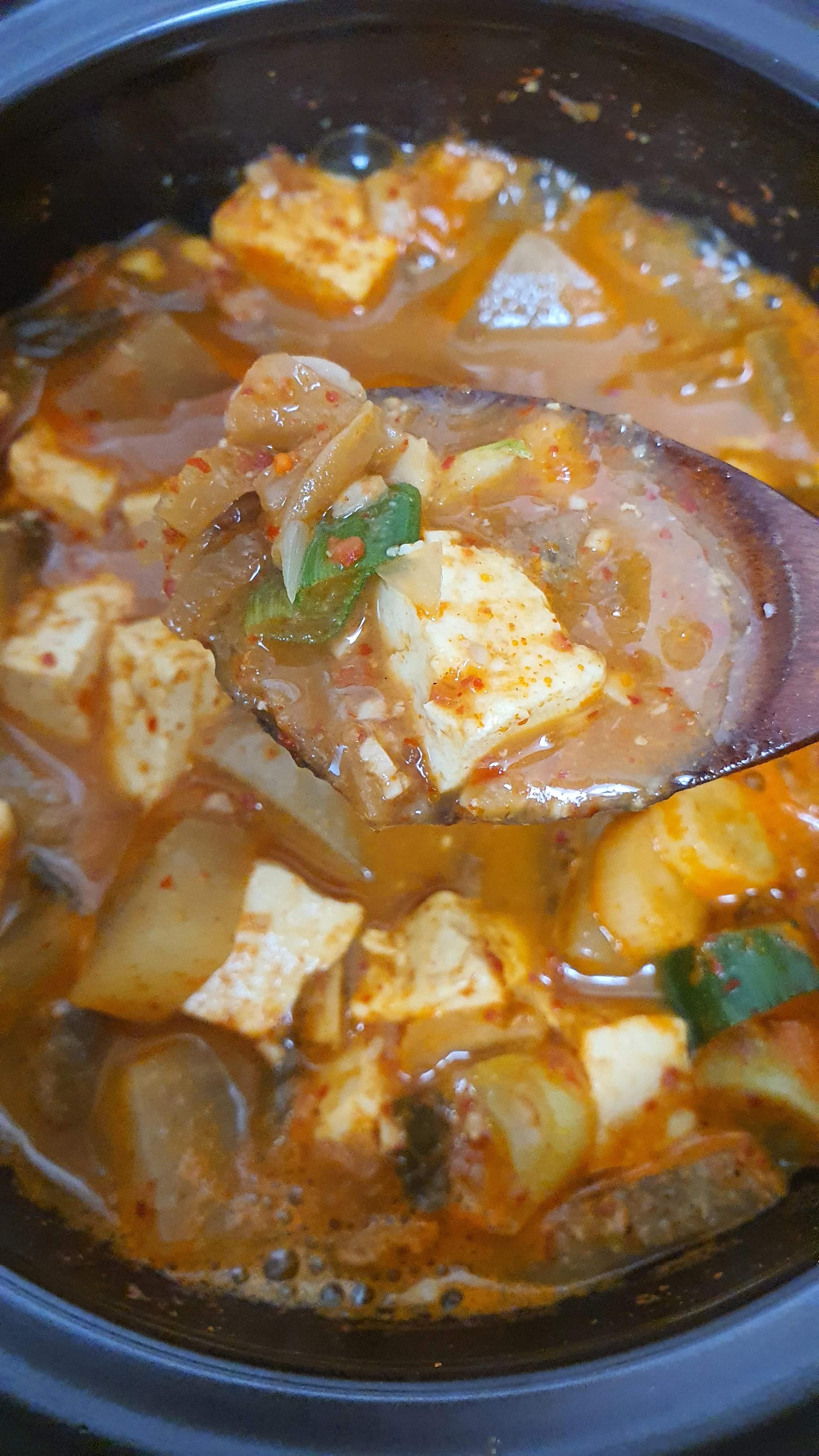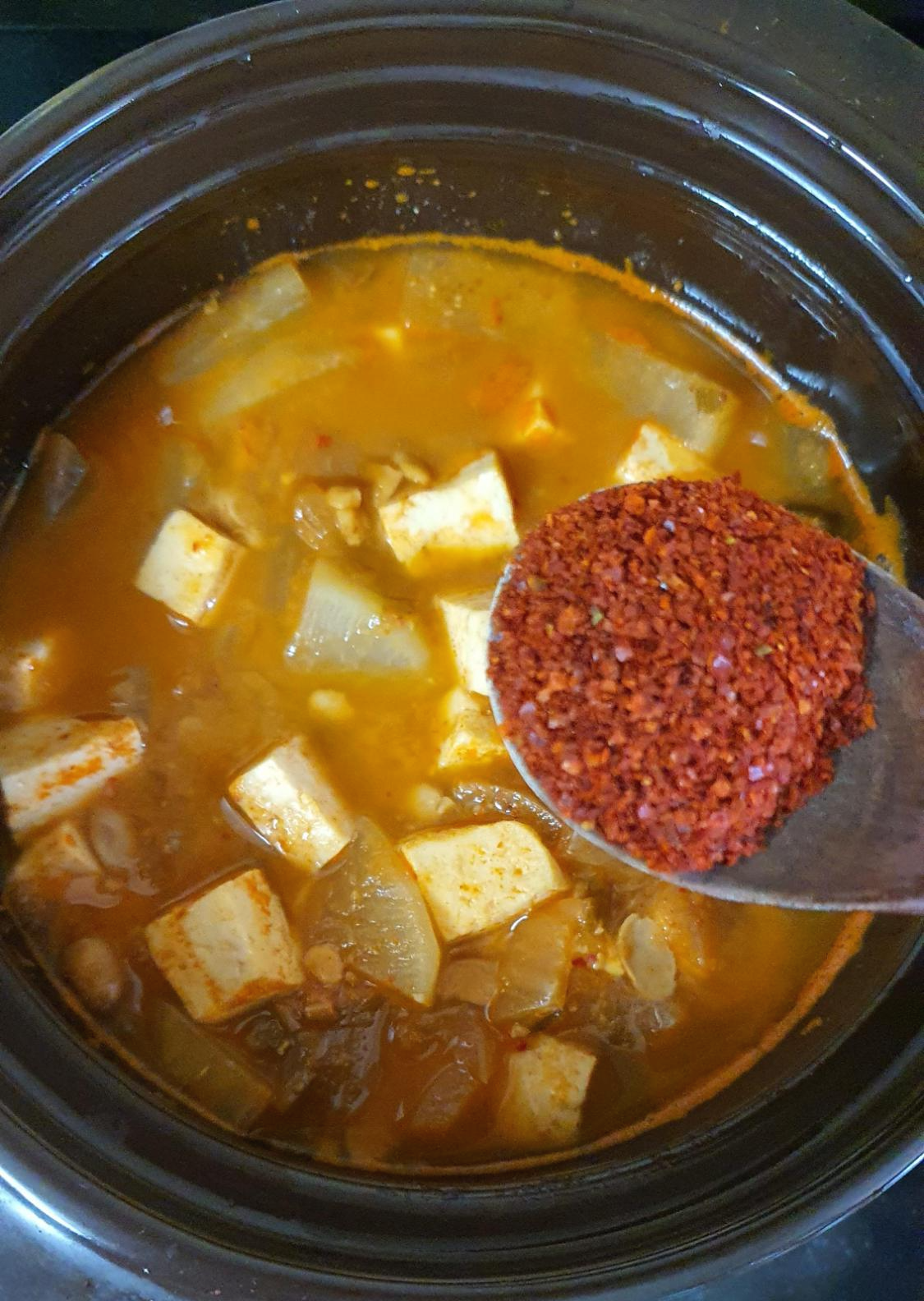 먼저 재료는 청국장, 두부, 김치, 무, 멸치, 다시마, 황태, 고춧가루이다.