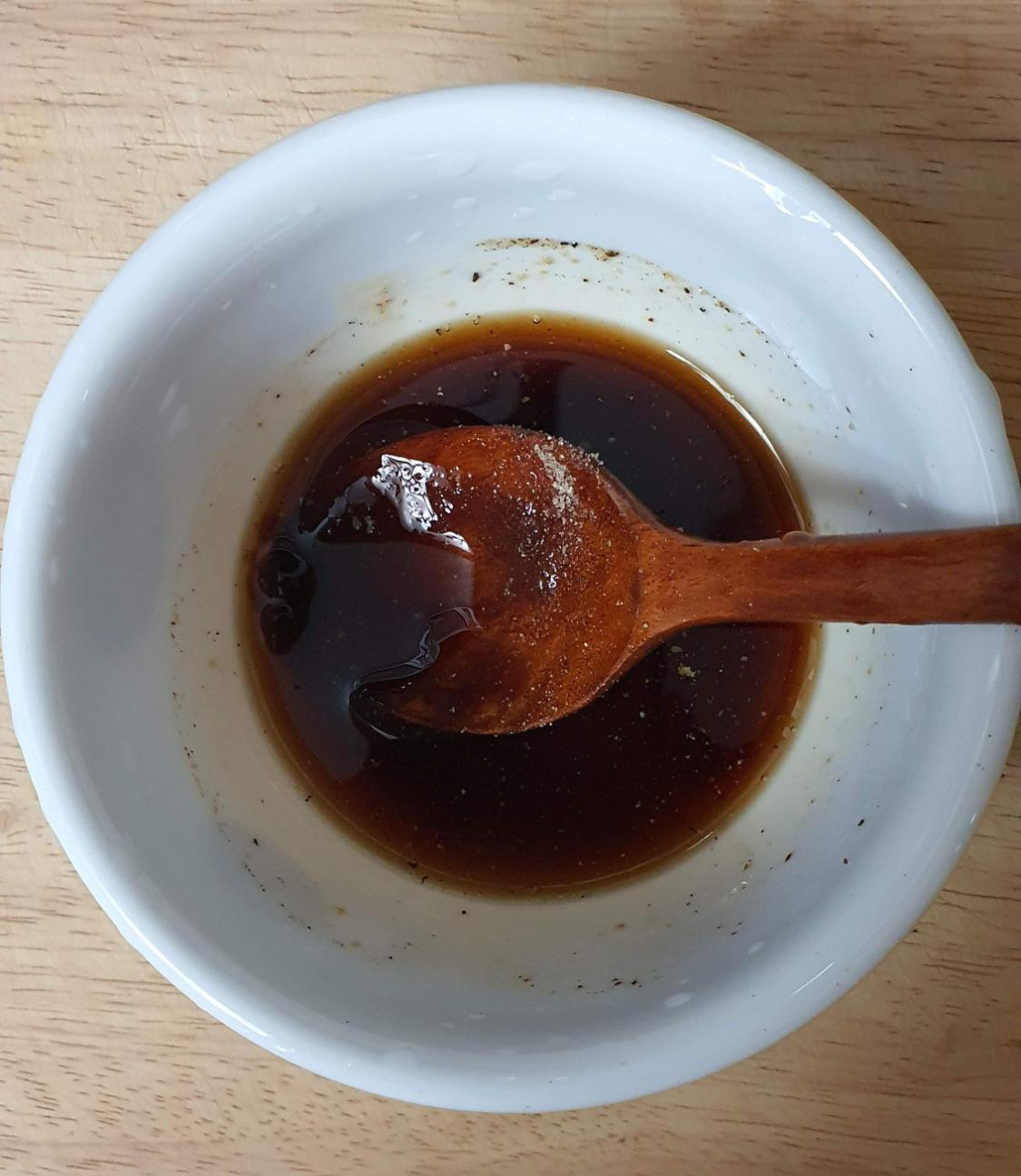 간장 한 스푼, 미림 한 스푼, 굴소스 한 스푼, 설탕 조금, 후추 조금 넣고 잘 섞어주기~!