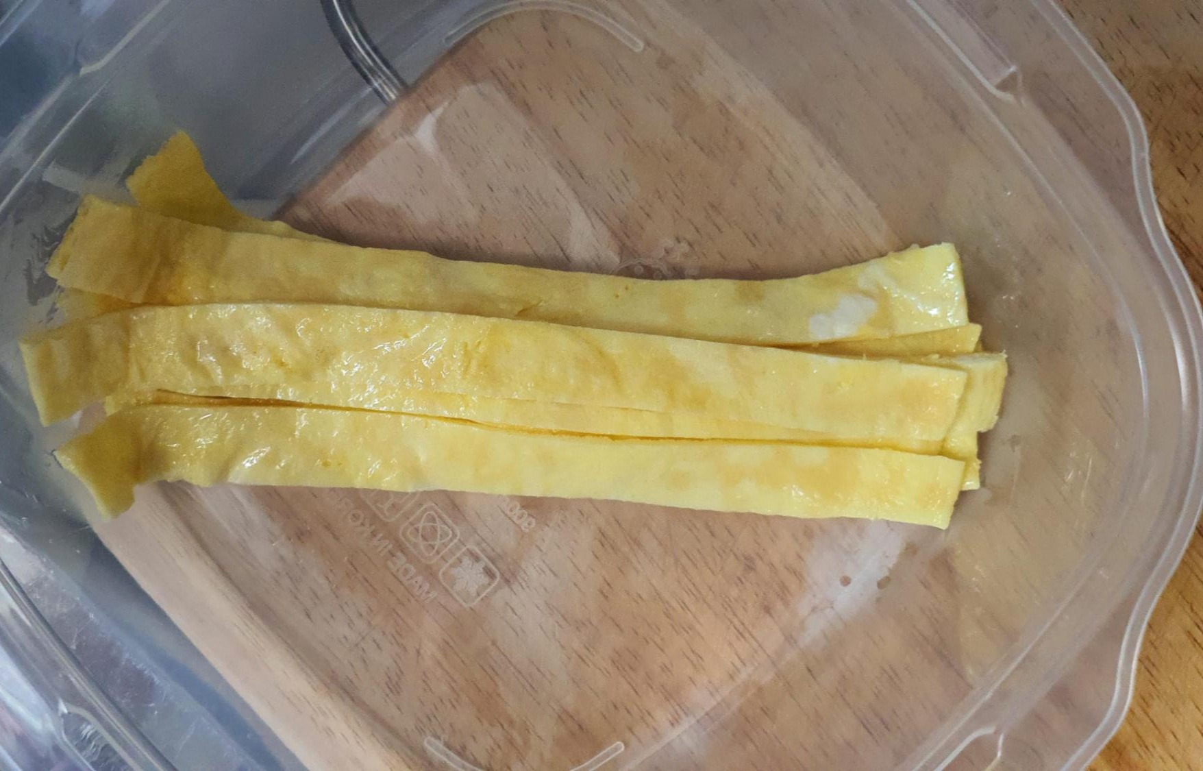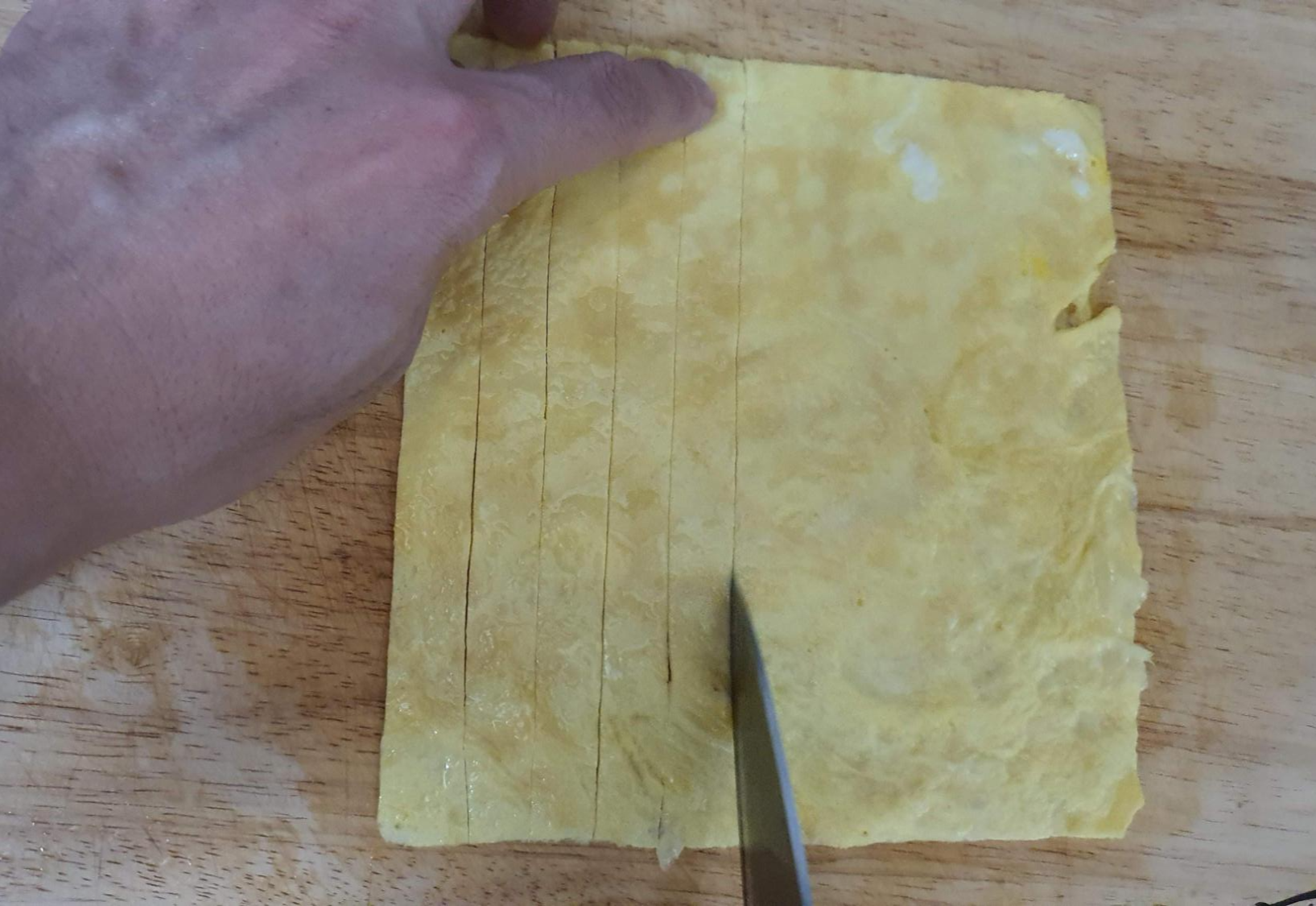 이제 네모 모양 계란을 길게 잘라주면 지단 만들기 끝~!