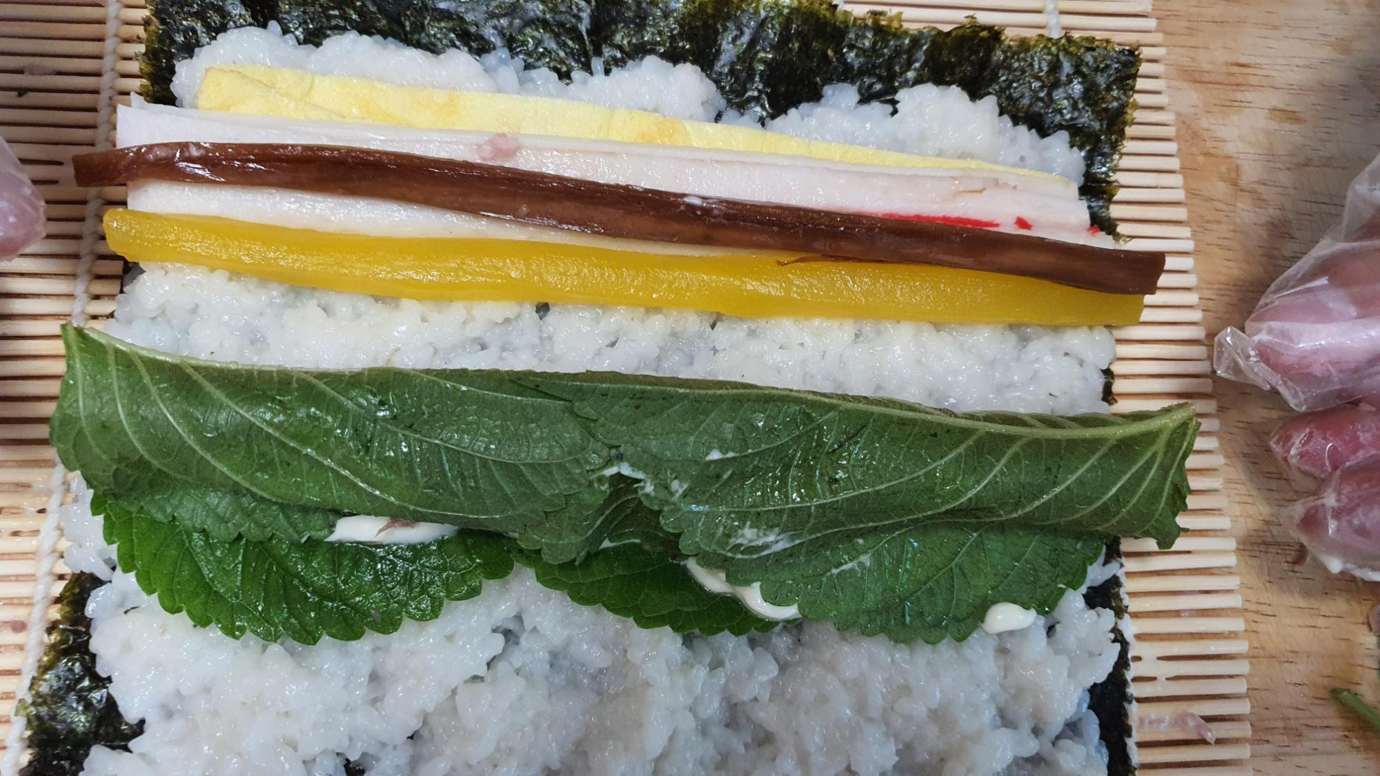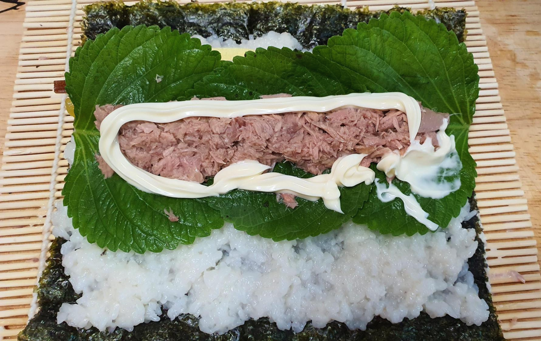 마요네즈 뿌린 다음에 깻잎은 따로 살짝 말아 놓았다.