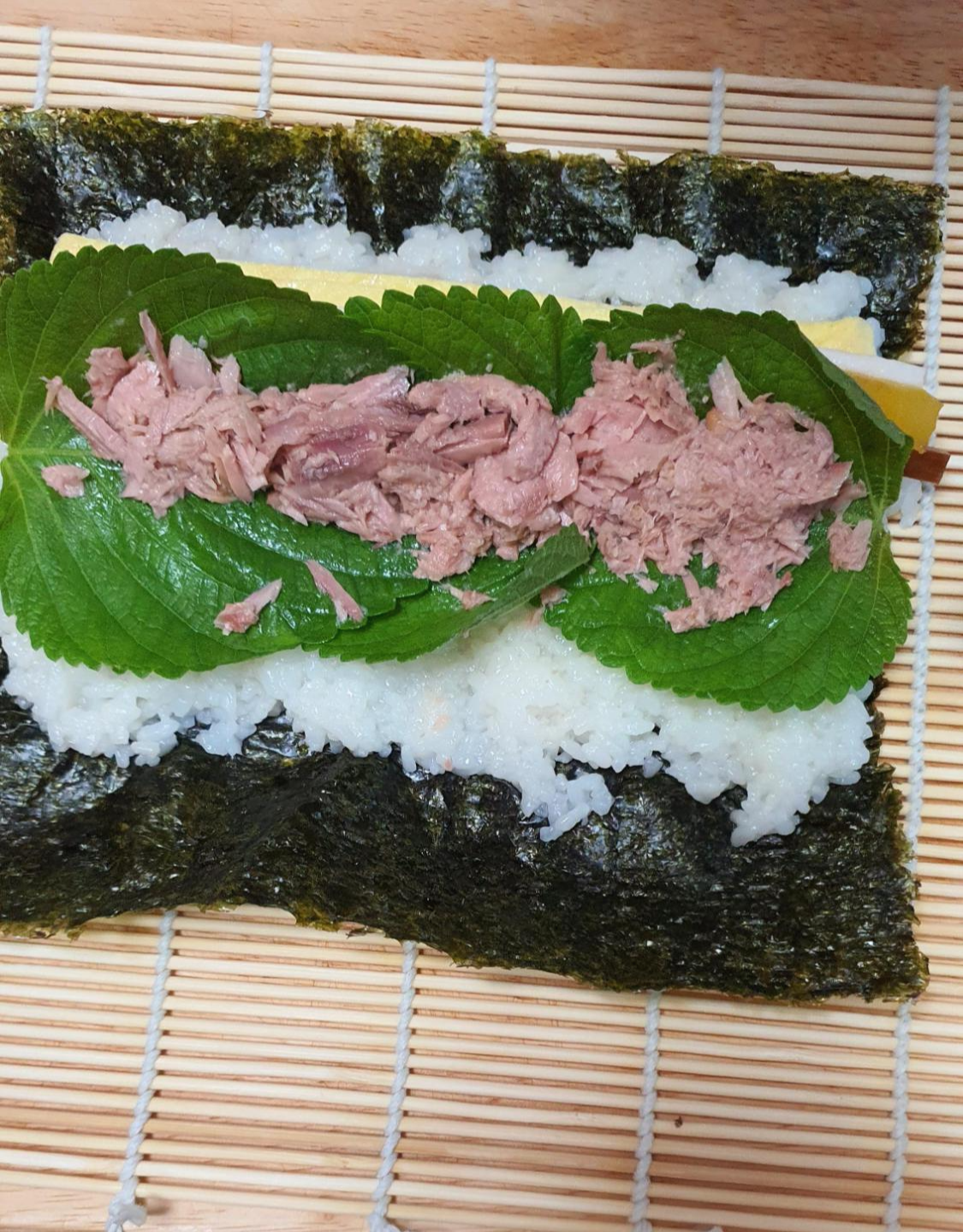참치는 이렇게 깻잎 위에 올려놓는다.