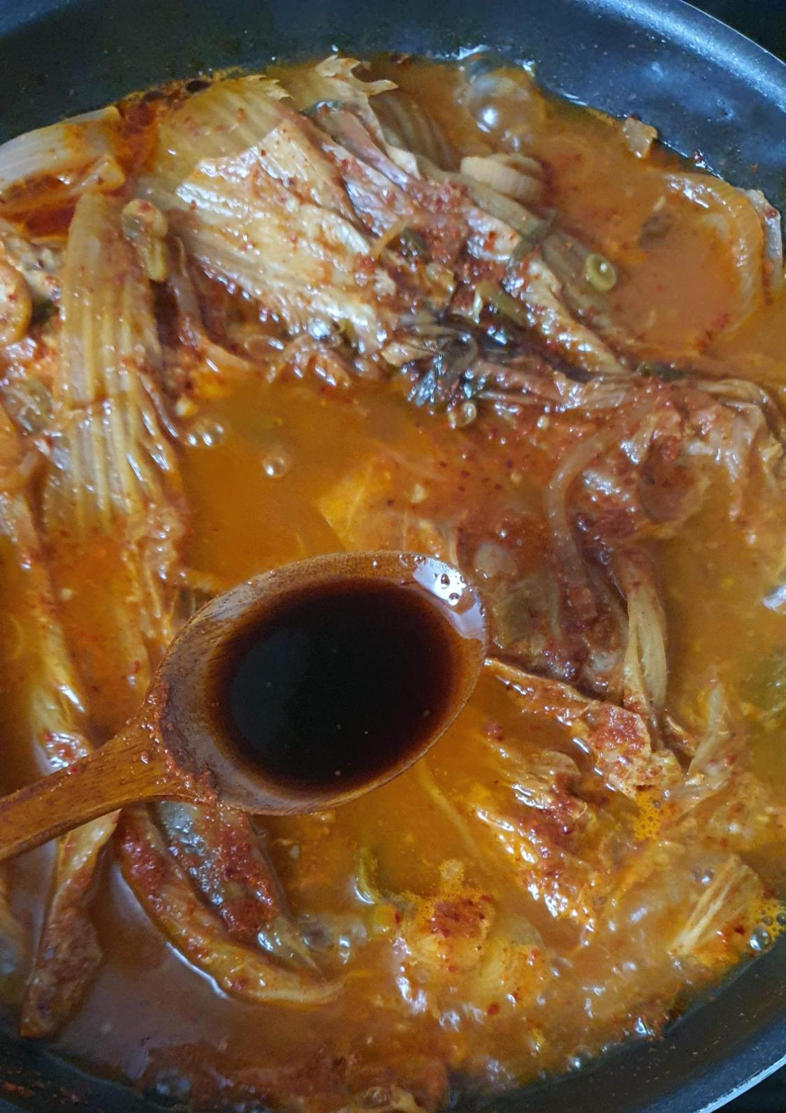 양념을 더하기 위해 김치 국물도 한 국자 넣어준다.