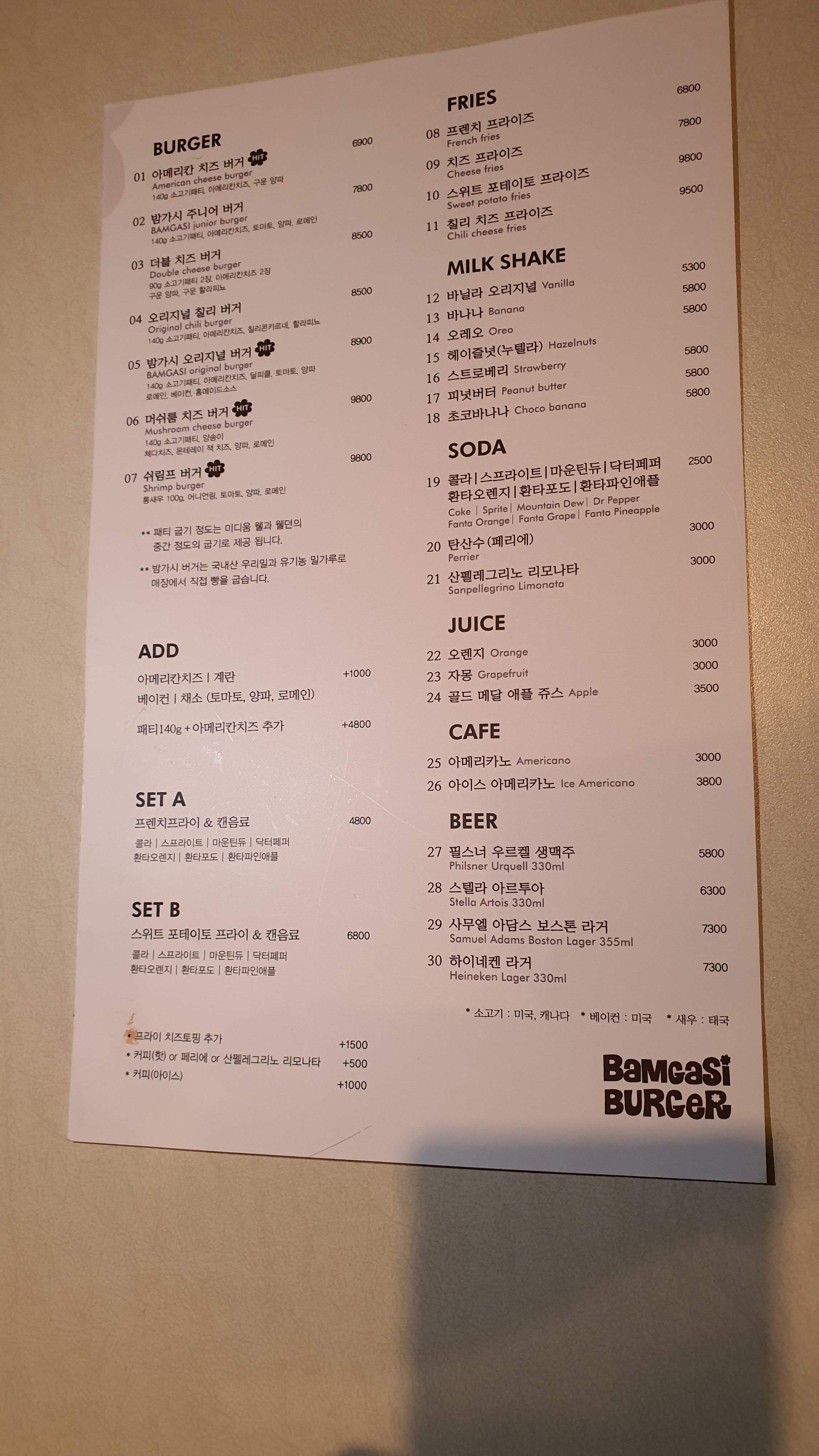 우리가 주문한 것은 밤가시 오리지널 버거와 쉬림프 버거 그리고 세트 A를 시켜
